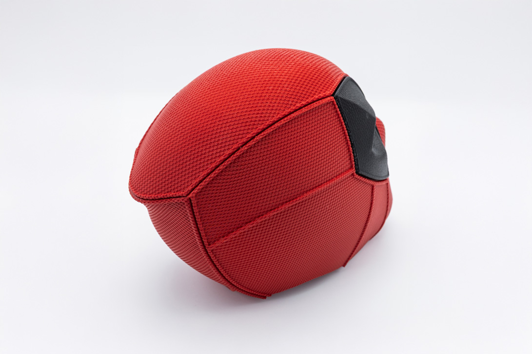 Máscara inspirada no icónico personagem Deadpool, recriada com detalhes marcantes através de impressão 3D. O design combina texturas e relevos que realçam as áreas vermelhas e pretas, incluindo os olhos estilizados com grelha branca.