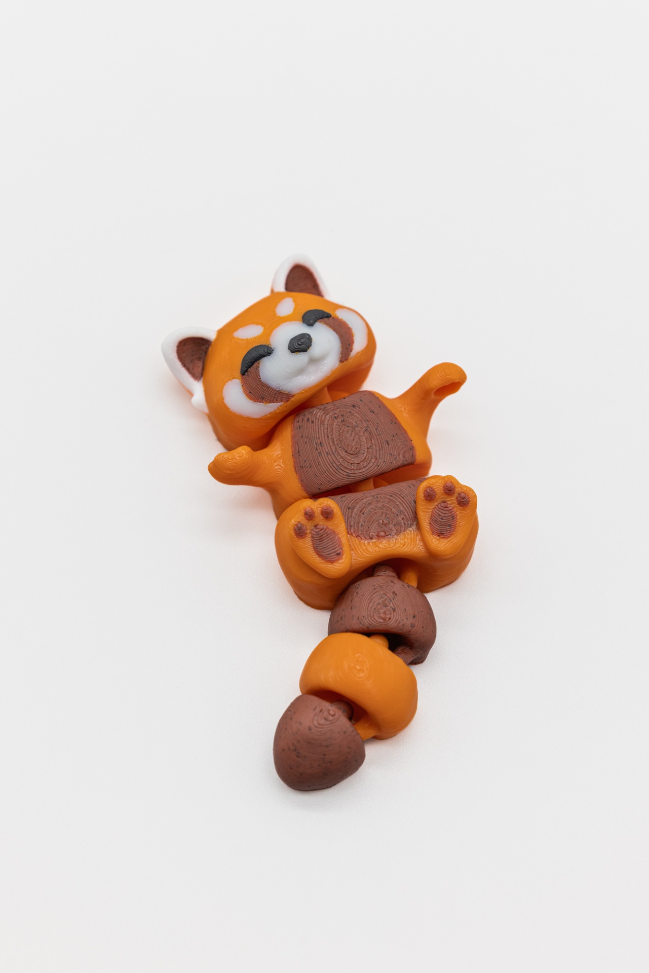Um adorável panda vermelho em versão articulada, impresso em 3D com detalhes realistas e acabamento suave ao toque.