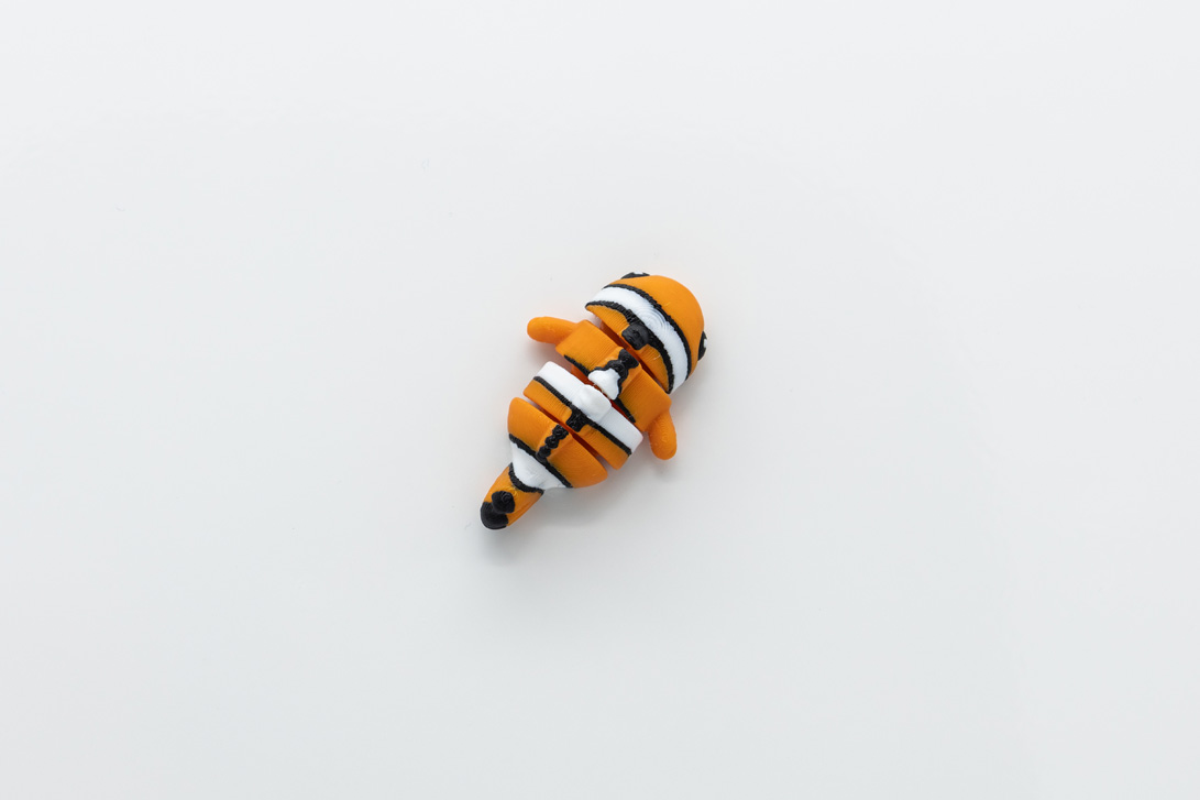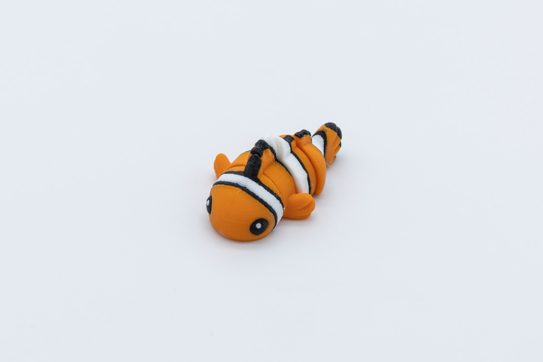 Diretamente dos recifes de coral para a tua casa! Este Peixe-Palhaço miniatura, impresso em 3D com cores vibrantes e corpo articulado, é ideal para quem adora o mundo marinho e criaturas encantadoras. Inspirado no famoso peixe tropical, este modelo capta na perfeição as características mais queridas do peixe-palhaço — corpo arredondado, riscas brancas marcantes e uma expressão simpática.